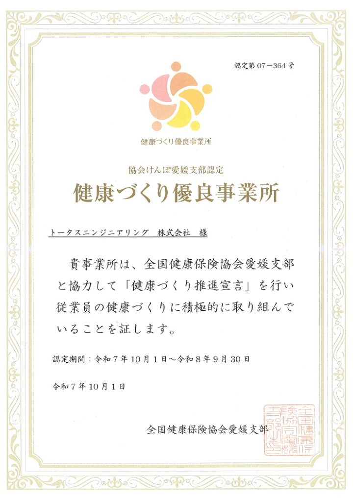 弊社は全国健康保険協会(協会けんぽ)愛媛支部が実施している「健康づくり推進宣言」を平成29年に行い、 実施結果レポート80点以上の事業所として今年度も「健康づくり優良事業所」に認定されました。 今後も従業員の健康づくりに努めて参ります。